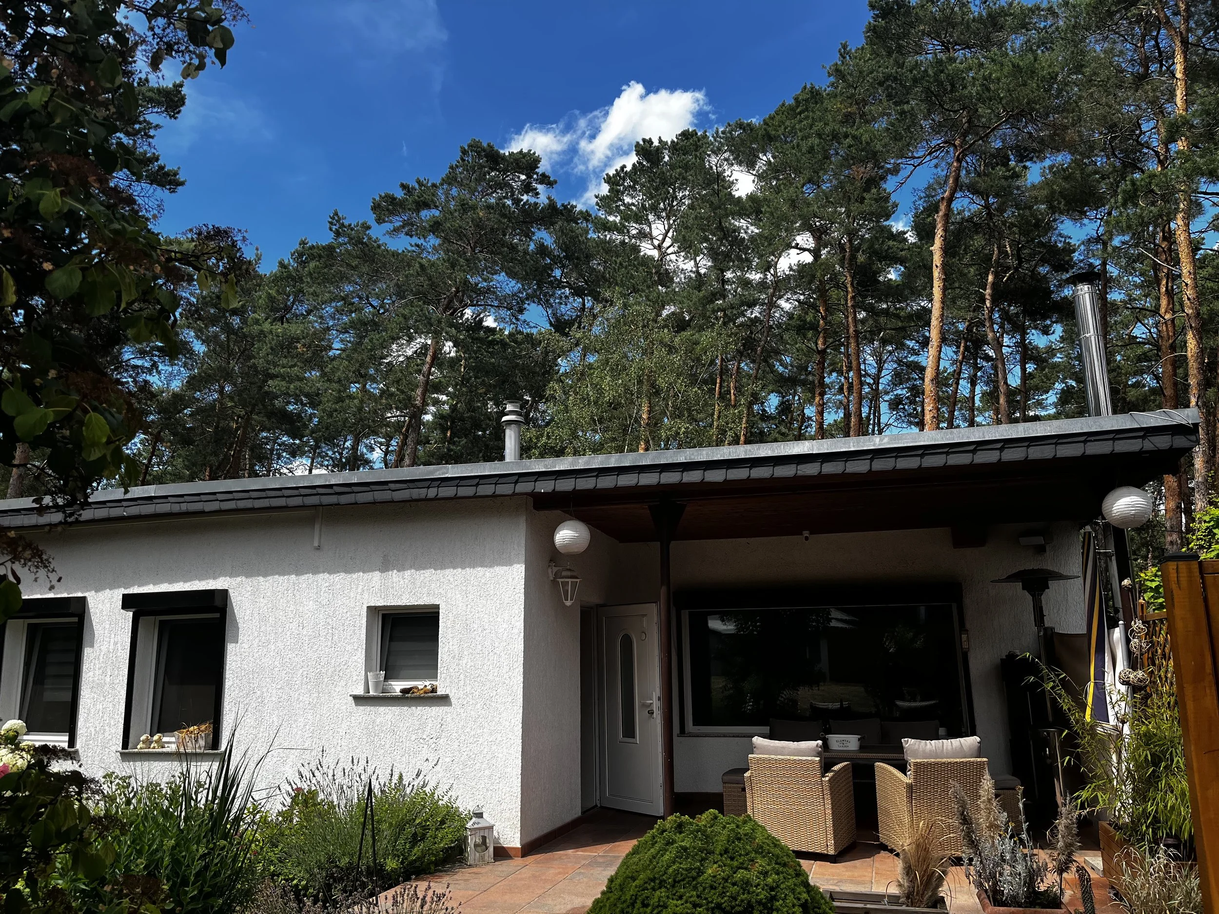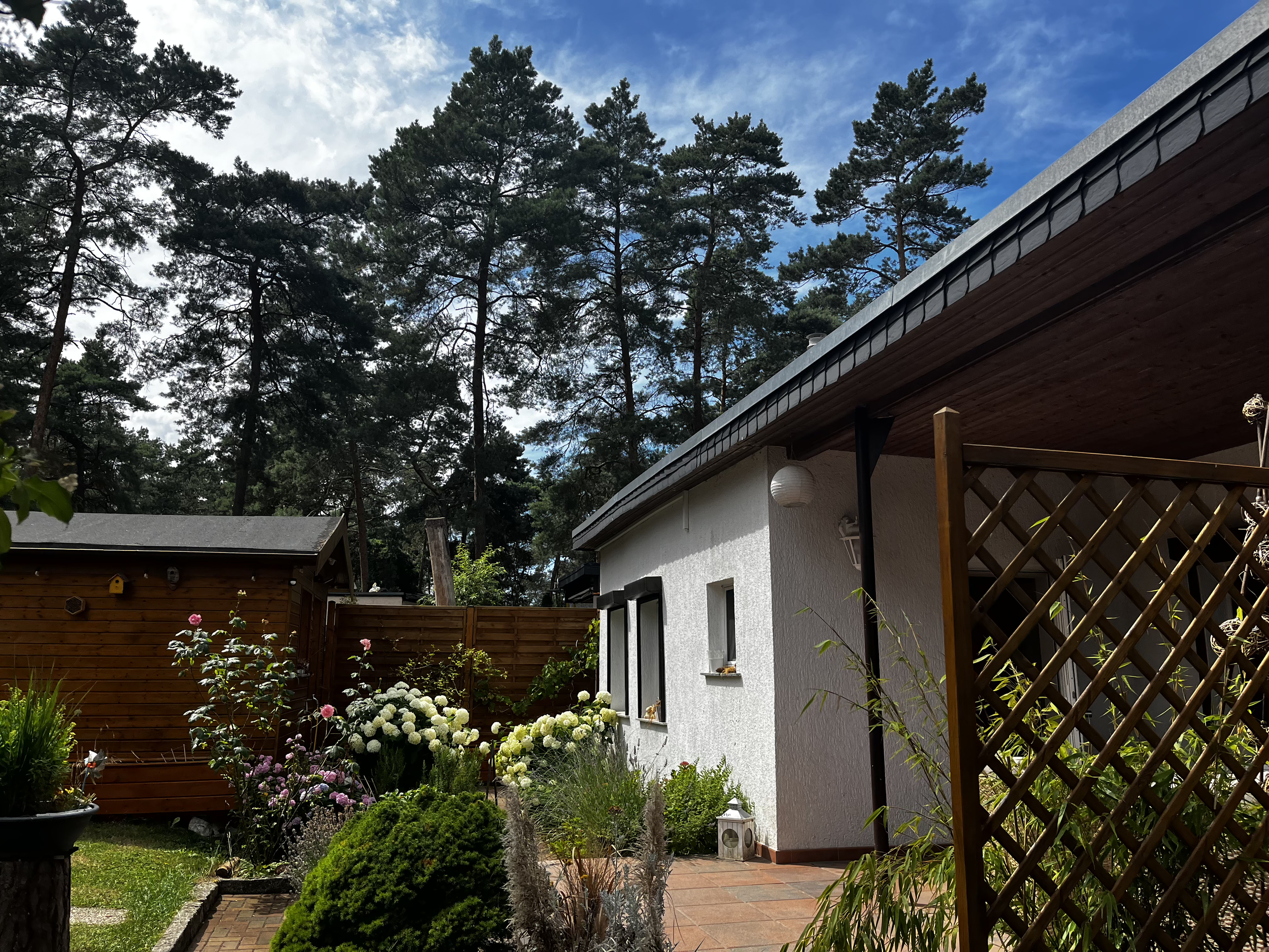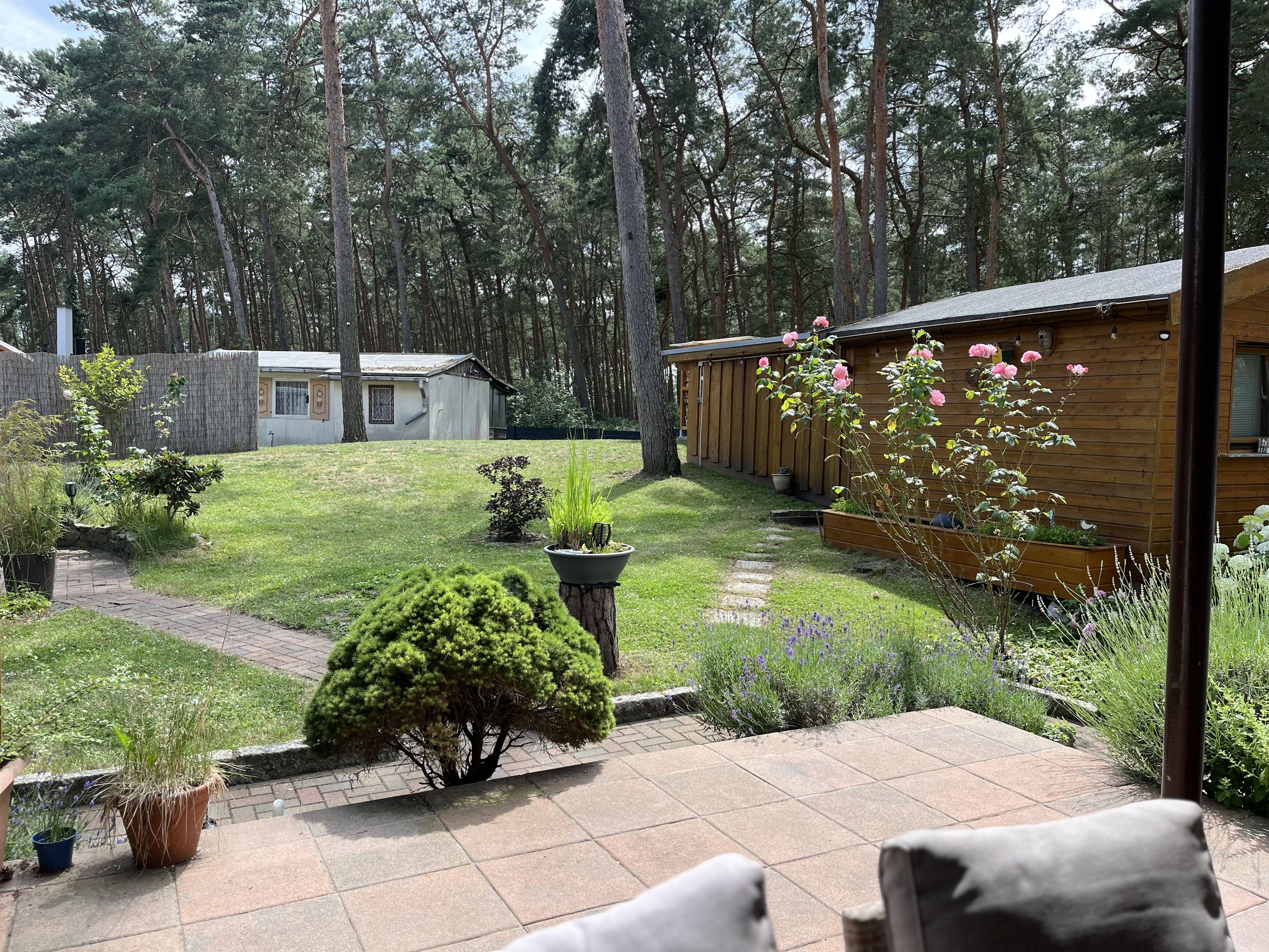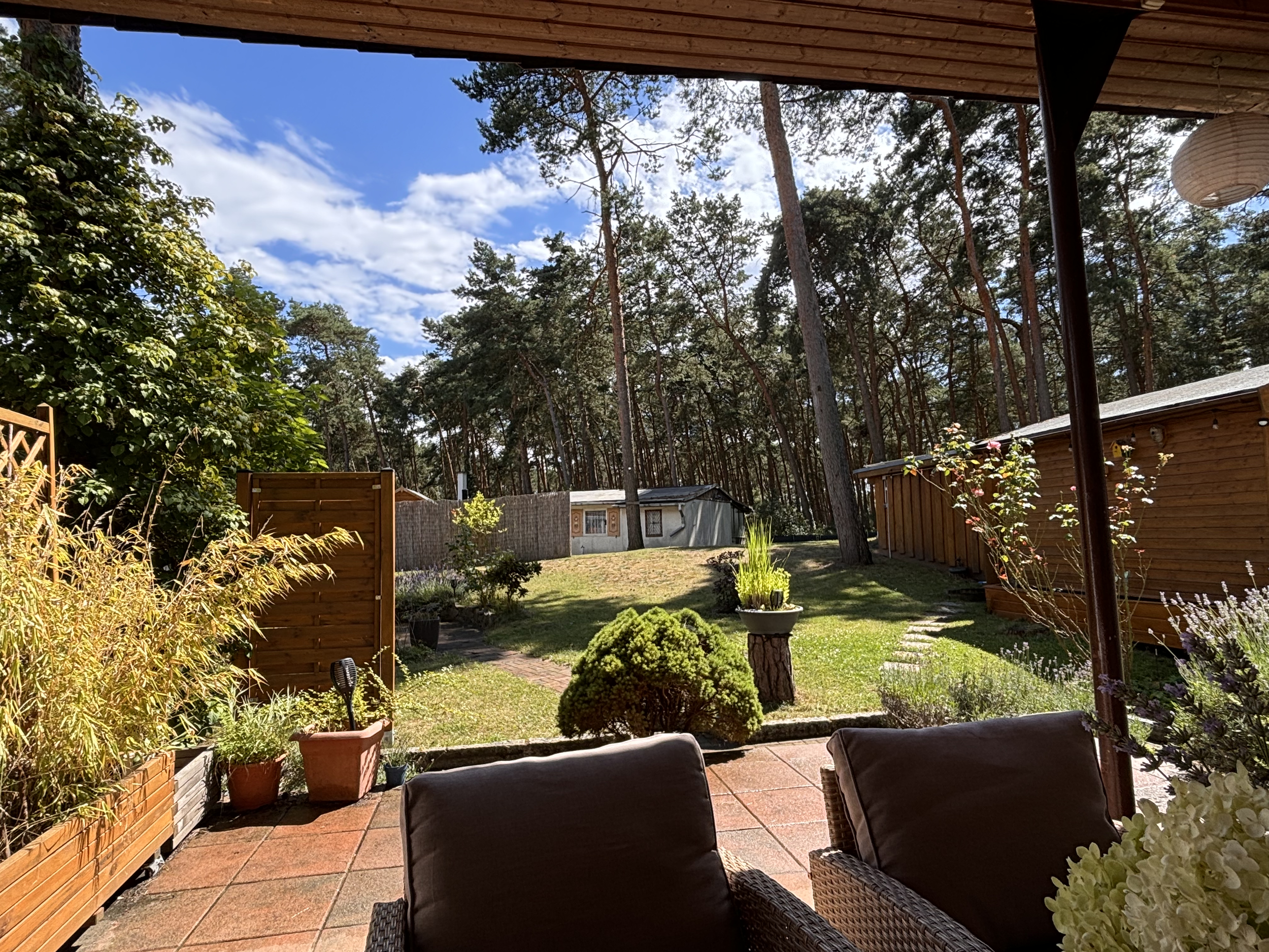 Der gemütliche Außenbereich mit überdachter Terrasse lädt dazu ein, den Tag bei Vogelgezwitscher und Waldblick ausklingen zu lassen. Ob Sonne oder Schatten – hier findet jeder sein Lieblingsplätzchen.